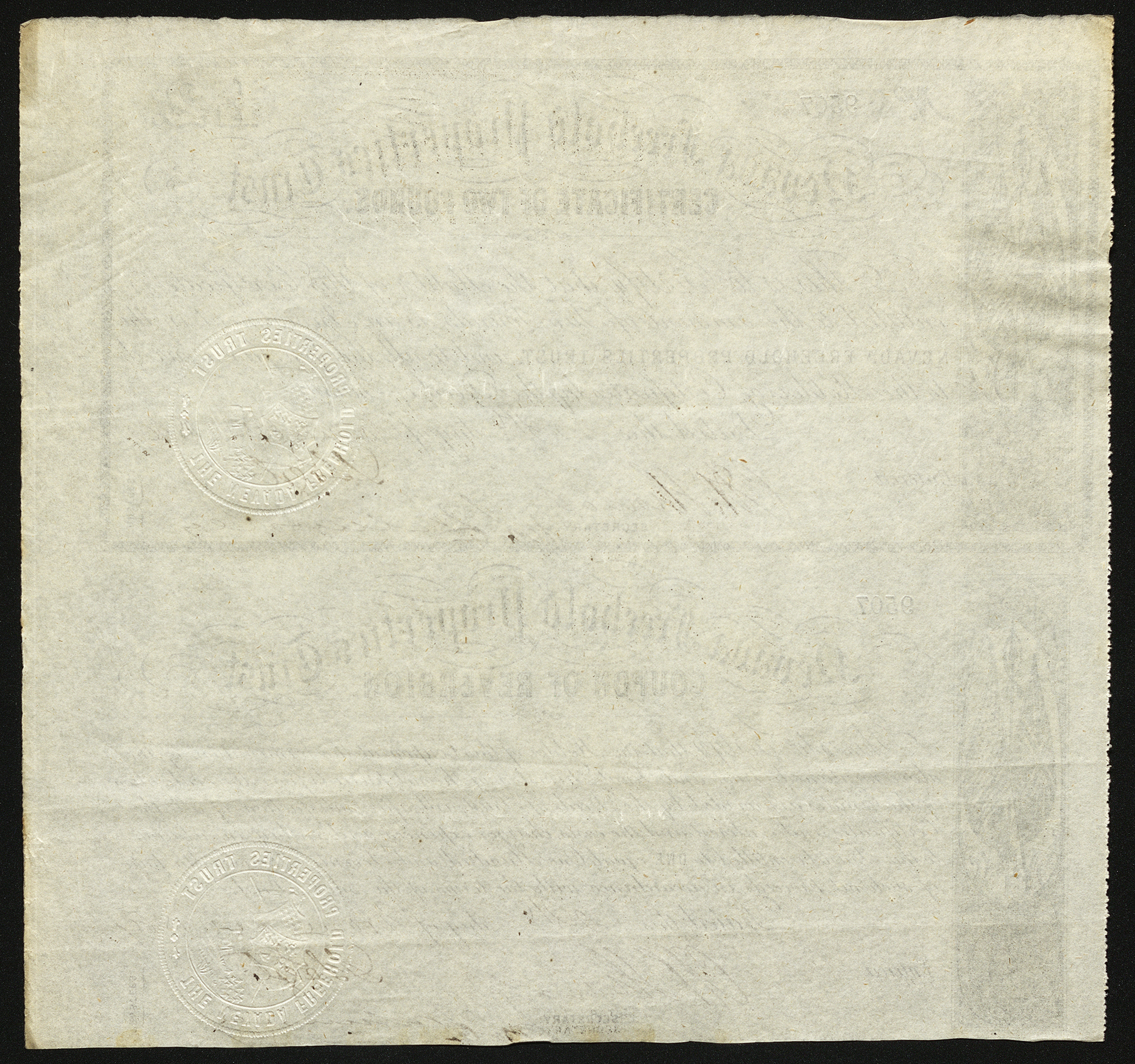 This stock certificate (No. 9507) represents £2 for the Nevada Freehold Property Trust.