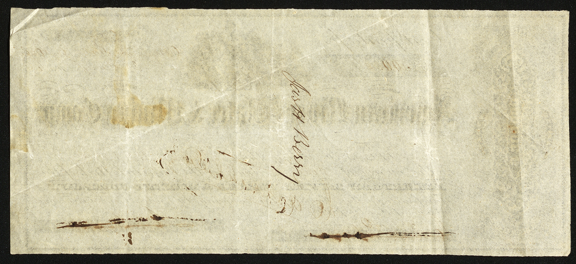 The American River, Water and Mining Company reads: Shares 3000 | $300,000 Capital Stock | $100 Each Certificate for $500. No 23 Carrollton, Placer Co. Cal. 28 January 1856 Incorporated December 1854 American River, Water and Mining Company This is to Certify that (illegible) H. Berry is the owner of Five Shares of the Capital Stock of the American River, Water and Mining Company. Transferable on the Books of the Company by Endorsement hereon and Surrender of this Certificate. Signed by the SEcretary C. S. H. (illegible) Signed by the President (illegible) On the back of this certificate is the signature Jas H. Berry