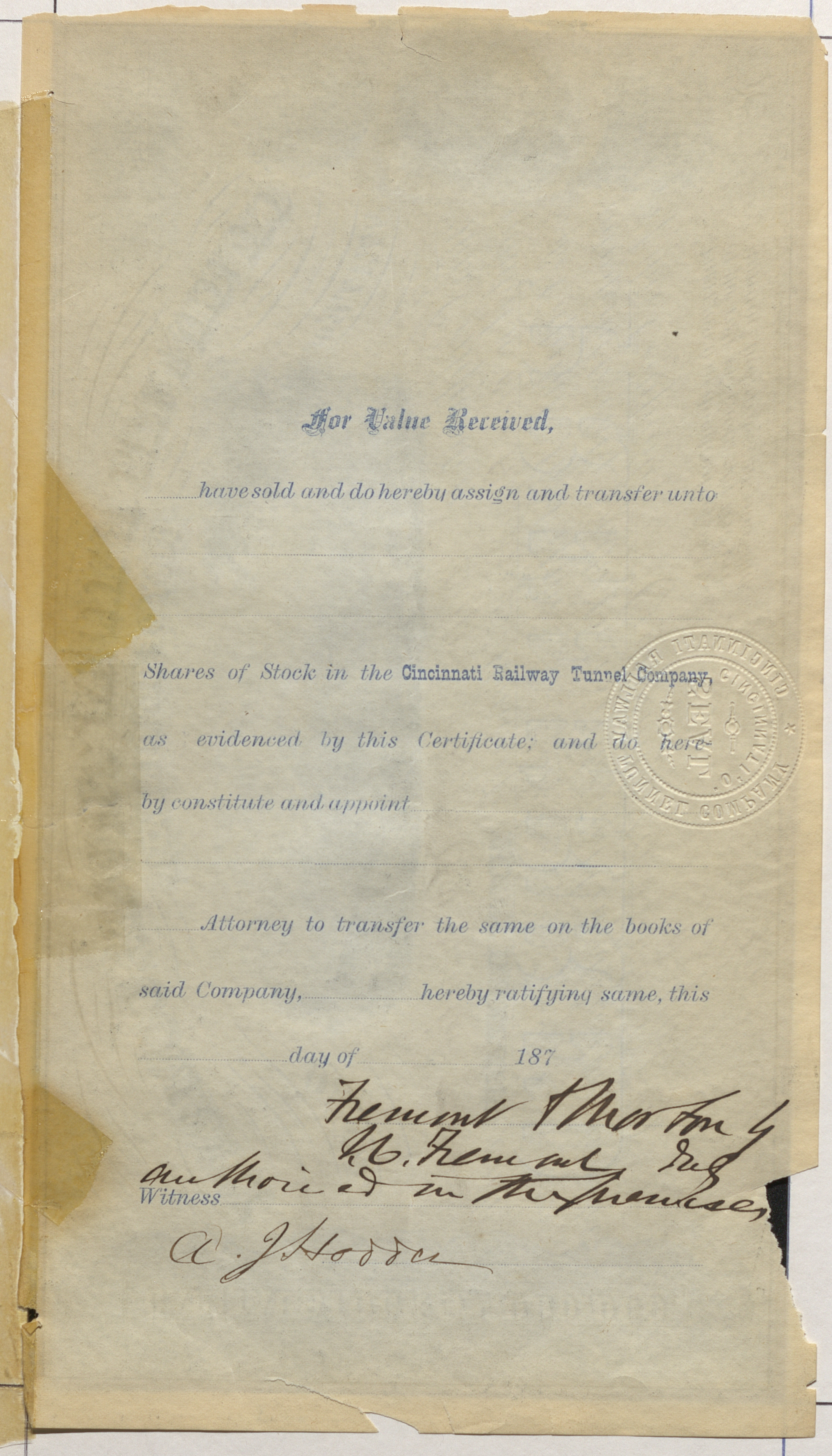 For Value received, _____ have sold and do hereby assign and transfer unto ____________ Shares of Stock in the Cincinnati Railway Tunnel Company, as evidenced by this Certificate; and do hereby constitute and appoint __________ Attorney to transfer the same on the books of said Company, __________ hereby ratifying same, this ______ day of 187_
