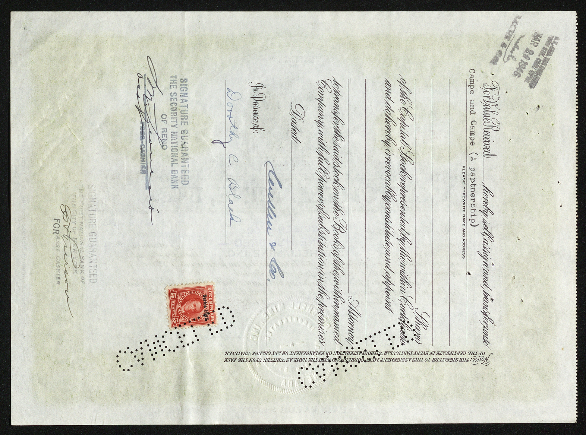 The Getchell Mine, Inc stock certificate reads: Number 3511 | Shares 100 Capital Stock $1,500,000.00 | 1,500,000 Shares | Par Value $1.00 Fully Paid and Non-Assessable Getchell Mine, Inc. Registered at Reno, Nevada Jan 31 1946 at Nevada Holding Company by the Registrar Law States This Certifies that Cullen & Co. is the owner of One Hundred shares of the Capital Stock of Getchell Mine, Inc. transferable only on the books of the Company by the holder hereof, in person or by Attorney upon surrender of this Certificate properly endorsed. In Witness Whereof, the said Company has caused this Certificate to be signed by its duly authorized officers and to be sealed with the Seal of the Company this Jan 31 1946 Signed by the Secretary T. L. Miller Signed by the President Geo Wingfield The back side of this certificate states: For Value Received ___ hereby sell, assign and transfer unto Campe and Campe (A partnership) Shares of the Capital Stock represented by the within Certificate and do hereby irrevocably constitute and appoint _____ Attorney to transfer the said stock on the Books of the within-named Company, with full power of substitution in the premises. Dated _____ Signed by (illegible) In Presence of: Dorothy C. Black Signature Guaranteed. The Security National Bank of Reno, signed by the President Cashier (illegible) N.V. Fed Tax — March 26 1946 Signed by (illegible) — Signature Guaranteed by the First National Bank of The City of New York, for Assistant Cashier (illegible) Stamp: Documentary Series 1945 United States Internal Revenue 5 Cents Notice: The signature to this assignment must correspond with the name as written upon the face of the certificate in every particular, without alteration or enlargement, or any change whatever.