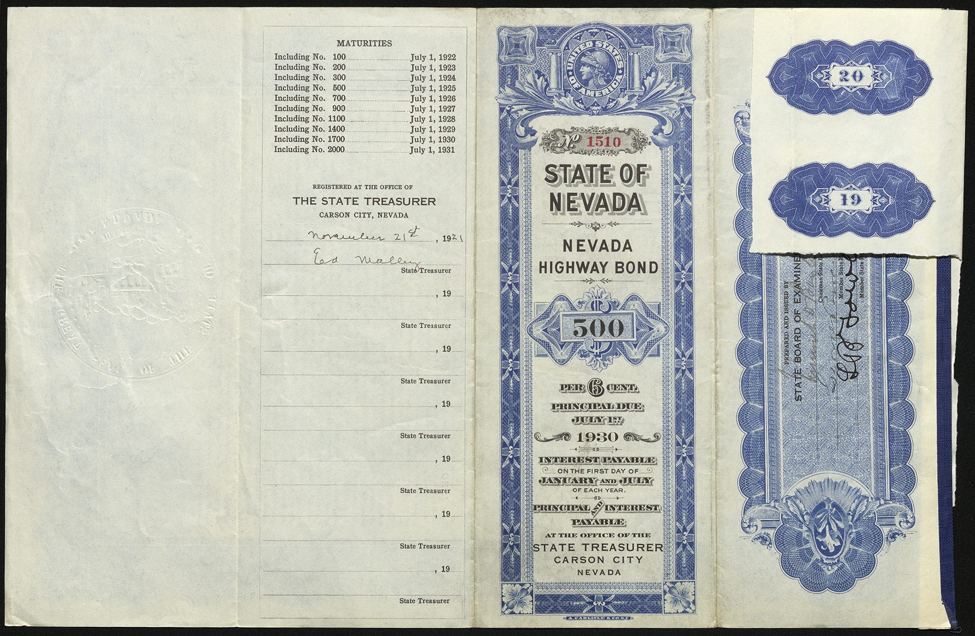 This certificate (No. 1510) represents $500 for the construction of the State of Nevada Highway. It is signed by Emmet D. Boyle, the 13th governor of Nevada and Nevada state senate from 1915 to 1923.