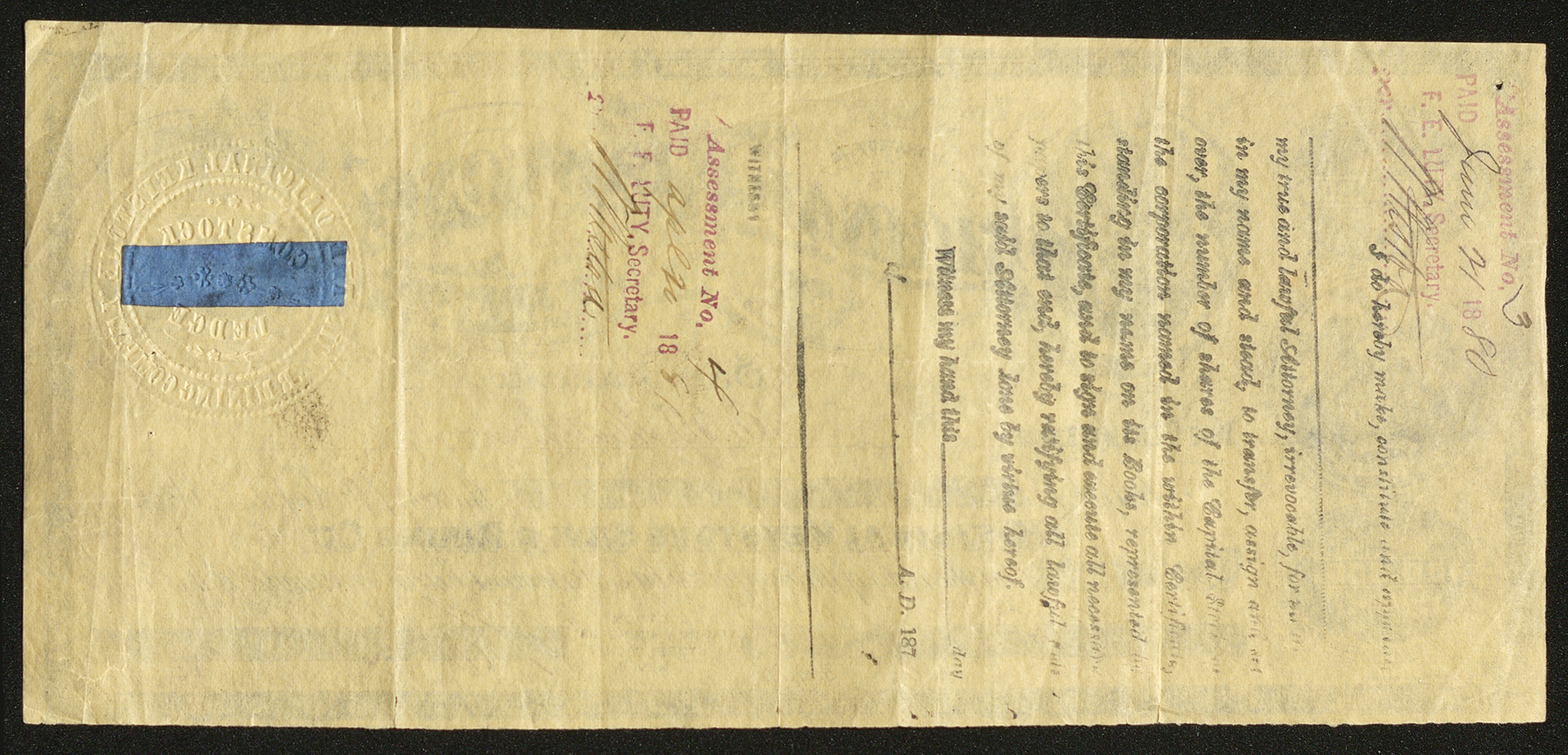 The backside of this document has 2 assessment dividend stamps, as well as a legal body of text stamped on.