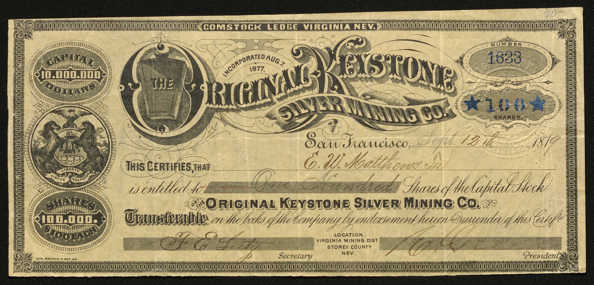 This stock certificate (No. 1633) represents 100 shares valued at $100 each for the Original Keystone Silver Mining Company. This mine was one of the first claims of the Comstock Lode.