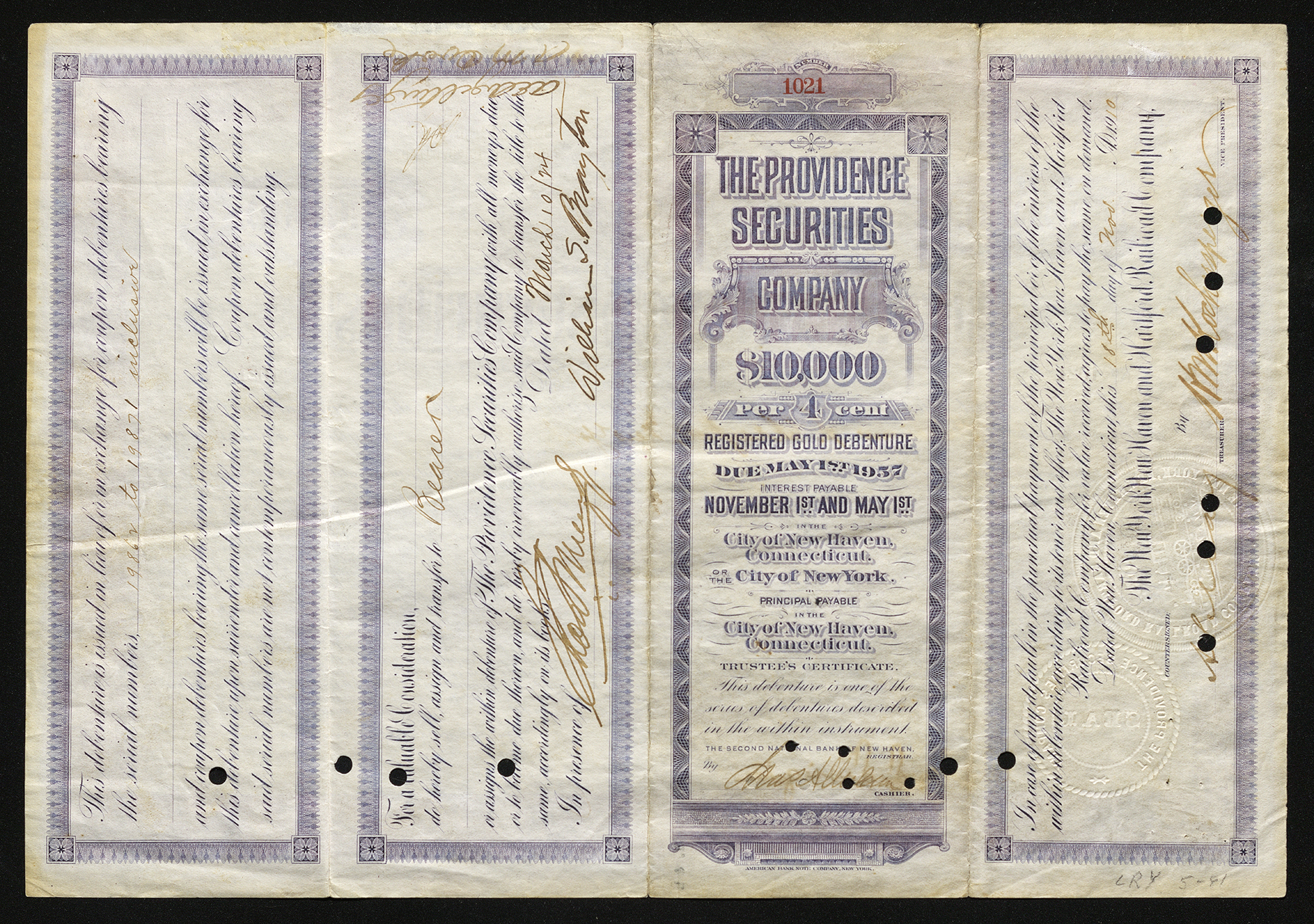 The Providence Securities Company stock certificate reads: No 1021 | $10,000 State of Connecticut The Providence Securities Company Four Per Cent. Registered Gold Debenture For value received, The Providence Securities Company, hereinafter called the promisor, acknowledges itself indebted to William S. Brayton, New York, N.Y. or registered assigns, in the sum of Ten Thousand Dollars ($10,000) and promises to pay said sum in gold coin of the United States of or equal to the present standard of weight and fineness, at the office of its Treasurer in the City of New Haven, State of Connecticut, on the first day of May, 1957, and to pay interest thereon from the first day of November 1910 until the maturity of this debenture, at the rate of four per centum per annum, such interest being payable semi-annually on the first days of November and May in each year at the said office of the Treasurer of the promisor, or, if so requested in writing by the payee, at the office of the Colonial Trust Company in the City of New York. Both the principal and interest of this debenture are payable without deduction for any taxes which the promisor may be required to pay or to retain or deduct therefrom under any present or future law of the united States or any state, county or municipality therein. This debenture is redeemable at the option of the promisor, its successors or assigns, on May 1, 1917, or on any interest due date thereafter at one hundred and five per centum and accrued interest, provided that notice of the election of said promisor to make such payment be given to the registered holder thereof by mailing such notice to his address as the same appears on the said books at least fifty-six days before the time designated for payment; and provided further, that there be deposited with the Second National Bank of New Haven, Connecticut, on or before the day in said noticed specified as the date for such payment cast to the amount of one hundred and five per centum of the principal hereof, together with the accrued interest thereon. The whole amount thus deposited for the redemption of this debenture shall be paid to the registered holder thereof, upon its delivery to said Second National Bank of New Haven duly transferred to the promisor. Notice being given and deposit made as herein provided, interest on this debenture shall cease on the date in such notice specified as the date for payment thereof, and the promisor shall be discharged from liability for the payment of further interest hereon. This debenture shall be transferable by the registered holder thereof in person or by attorney duly authorized on the books of the promisor, at the said office of its Treasurer. Upon surrender for cancellation of this debenture ten coupon debentures of the face value of $1,000. each, with coupons attached maturing on and after the then next ensuing interest due date of this debenture, will be issued for the same. This debenture shall not be valid until it shall have been authorized by the signature of the Second National Bank of New Haven. In Witness Whereof, The Providence Securities Company has caused its corporate seal and the signature of its President or a Vice-President and of its Treasurer or an Assistant Treasurer to be hereto offered this 18th day of Nov. 1910 at its office in the City of New Haven, Connecticut. The bottom of this certificate is countersigned by Charles L. Livington, who is denoted as the Treasurer, and signed by James D. Brady, who is denoted as the President On the bottom of the certificate, partially covering the signature of the countersigner, is a stamp in black ink that reads: a notice that reads: Surrendered Mar 11, 1914 Transferred and cancelled. On the back side of The Providence Securities Company stock certificate, there are four columns. From top-to-bottom, the columns read: This debenture is issued in lieu of or exchange for coupon debentures bearing the serial numbers 19862 to 19871 inclusive and coupon debentures bearing the same serial numbers will be issued in exchange for this debenture upon surrender and cancellation hereof. Coupon debentures bearing said serial numbers are not contemporaneously issued and outstanding. For a Valuable Consideration _______________ do hereby sell, assign and transfer to Bearen or assigns the within debenture of the Providence Securities Company with all moneys due, or to become due thereon, and do hereby irrevocably authorize said company to transfer the title to the same, accordingly on its books in the presence of Rob Murefs William S. Brayton. Dated March 10, 1914 *On the side of this document, in blue ink, are the letters aeaigiltings. This next column is in the form of a pamphlet, and from top-to-bottom reads: Number 1021. The Providence Securities Company. $10,000 per 4 cent. REGISTERED GOLD DEBENTURE. DUE MAY 1ST IN THE CITY OF NEW HAVEN, CONNECTICUT. OR THE CITY OF NEW YORK. Principal payable in the City of New Haven, Connecticut. Trustees certificate. This debenture is one of the series of debentures described in the within instrument the Second National Bank of New Haven. *Following the previous text, this column then specifies the registrar as The Second National Bank of New Haven, and is then signed by (illegible), who is denoted as the cashier. In case of any default in the punctual payment of the principal or of the interest of the within debenture, according to its tenor and effect. The New York, New Haven and Hartford Railroad Company, for value received, agrees to pay the same on demand. Dated New Haven, Connecticut, this 18th day of Nov A.D. 1910. The New York, New Haven and Hartford Railroad Company, Countersigned by the Treasurer (illegible) Signed by the Vice President (illegible) This stock certificate (No. 1021) represents the amount of $10,000 for The Providence Securities Company.