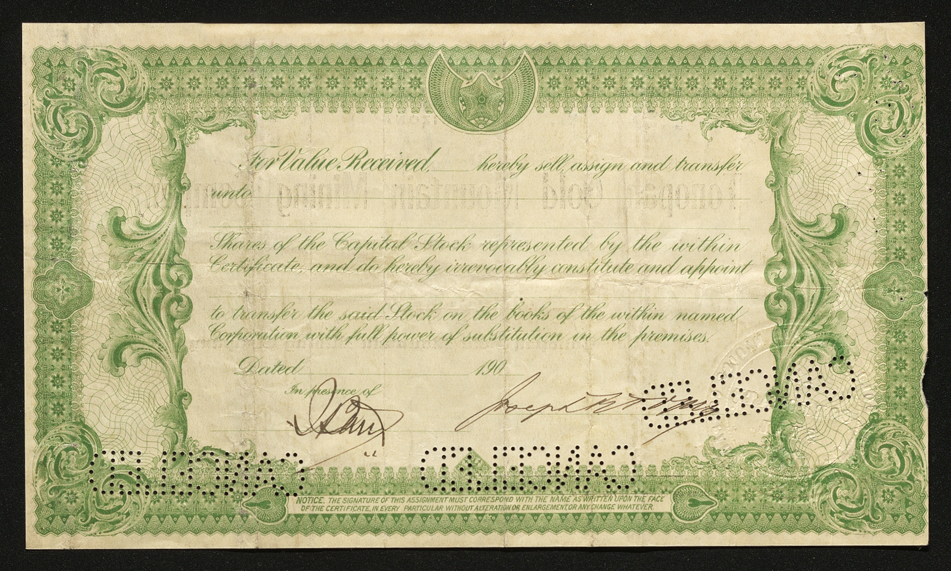This Certifies That Joseph. R. Toplit. is the owner of One Hundred Shares of the Capital Stock of Tonopah Gold Mountain Mining Company transferable only on the books of the Corporation by the holder hereof in person or by Attorney, upon surrender of this Certificate properly endorsed.