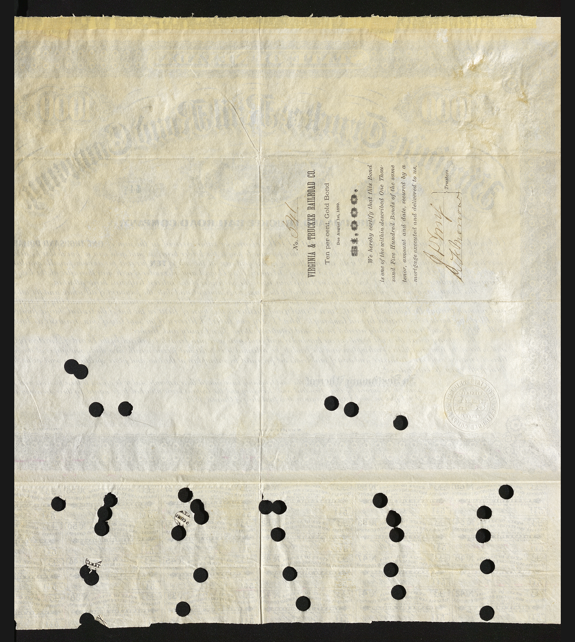 The Virginia & Truckee Railroad Company bond certificate reads: State of Nevada $1000 Virginia and Truckee RailRoad Company Bond | No 541 The Virginia and Truckee RailRoad Company Acknowledge themselves to be indebted to Thomas Bell, or bearer, for value received, in the sum of One Thousand Dollars Gold Coin of the United States of America, which sum they promise to pay to the holder hereof in said gold coin at par dollar for dollar on or before the first day of August, 1889, with interest thereon in like gold coin at the rate of Ten per cent per annum, payable quarterly on the first day of November. 1874, and on the first days of February, May, August and November of each year thereafter, at the City of Virginia, Nevada, or at the City of San Francisco, California, upon the surrender of the interest coupons hereto attached. This Bond being on of one thousand five hundred of the same tenor, amount, and date, the payment of all which, and the interest thereon is secured by a Mortgage upon the Railroad of said Company in the State of Nevada, commencing at the said City of Virginia and running through the Counties of Storey, Lyon, Ormsby, and Washoe to the Town of Reno on the line o f the Central Pacific Railroad, said Mortgage having been executed by said Company to John D. Fry and Robert F. Morrow, of the said City of San Francisco, as Trustees for the holders of said bonds, and duly recorded in the said Counties of Storey, Lyon, Ormsby, and Washoe. The Company reserve the right to redeem one hundred of said bonds each year, such bonds to be selected by the Board of Directors by lot, and notice of the time and place of redemption and the bonds to be redeemed to be published for one month in a daily newspaper at the said Cities of Virginia and San Francisco, and any of said bonds not presented for redemption at the time and place specified in said notice shall thenceforth cease to bear interest. In Testimony Whereof the said Company have caused their corporate seal to be affixed to these presents, and the same to be signed by their President and Secretary, and the Coupons hereto attached to be signed by their Secretary, at their Office in said City of Virginia, this for day of August, 1874. Signed by the Secretary (illegible) Signed by the President W. Sharon At the bottom of the stock certificate are 24 of 60 of the aforementioned coupons of interest. They are all identical, except the months, and the number of the coupon goes up by one, starting at 37, ending at 60. They read: 25 | No 37-60 State of Nevada Virginia and Truckee RailRoad Company Due Nov/Feb/May/Aug/Nov 1st 1883 - 1889 Interest Coupon Twenty Five Dollars Gold Coin of the United States of America On Bond No 541 Signed by the Secretary Geo — Krieg The back side of this bond states: No. 541 Virginia & Truckee Railroad Co, Ten per cent. Gold Bond Due August 1st, 1889 $1,000. We hereby certify that this Bond is one of the within described One Thousand Five Hundred Bonds of the same tenor, amount and date, secured by a mortgage executed and delivered to us. Signed by Trustees (illegible) and (illegible)